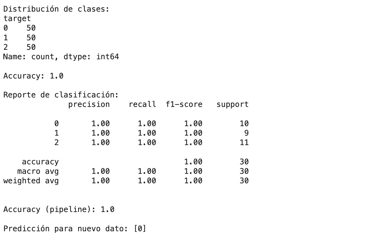 En este paso se utilizan métricas como accuracy (precisión global), que indica qué proporción de predicciones fueron correctas, y el reporte de clasificación, que proporciona métricas más detalladas como precision, recall y f1-score por clase. Estas métricas son especialmente importantes cuando trabajamos con datasets desbalanceados o con múltiples clases, como es el caso del dataset de Iris. Evaluar el modelo permite detectar problemas como el sobreajuste (overfitting) o el subajuste (underfitting), y es clave para decidir si es necesario mejorar el preprocesamiento, ajustar hiperparámetros o probar con modelos más sofisticados.