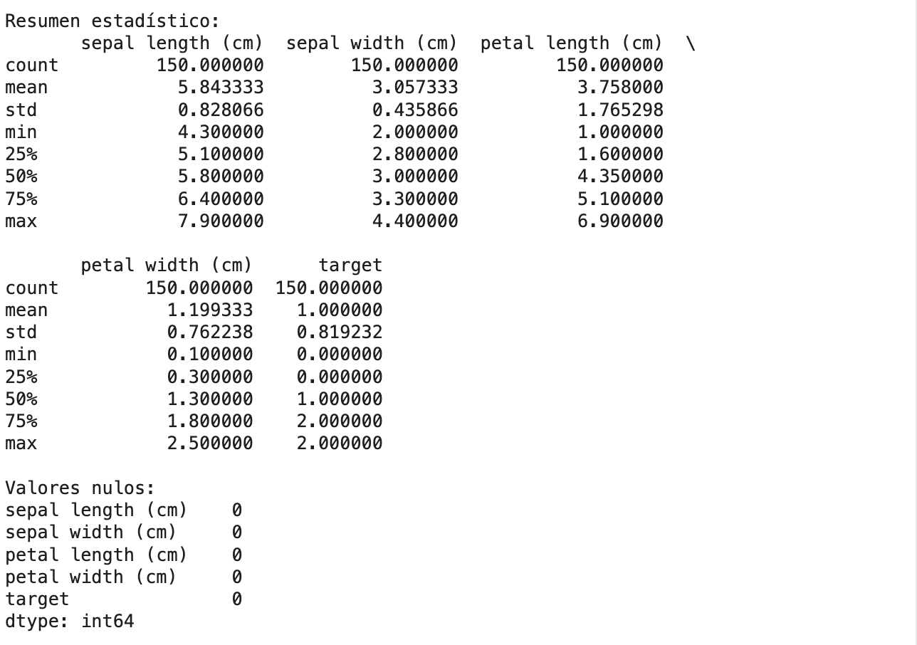 Además, se realiza una limpieza básica de datos, que incluye la detección de valores nulos o faltantes, la búsqueda de valores atípicos (outliers) y la verificación de tipos de datos incorrectos. Aunque en el dataset de Iris no hay valores nulos ni anomalías evidentes, en proyectos reales estos problemas son comunes y pueden afectar negativamente el rendimiento del modelo si no se abordan. Este paso asegura que los datos estén en condiciones óptimas para alimentar el modelo de aprendizaje automático.